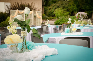 They paired our Tiffany blue table toppers with bunched up lace table toppers cute vases parfait cups with pearls makes gorgeous centerpieces.
