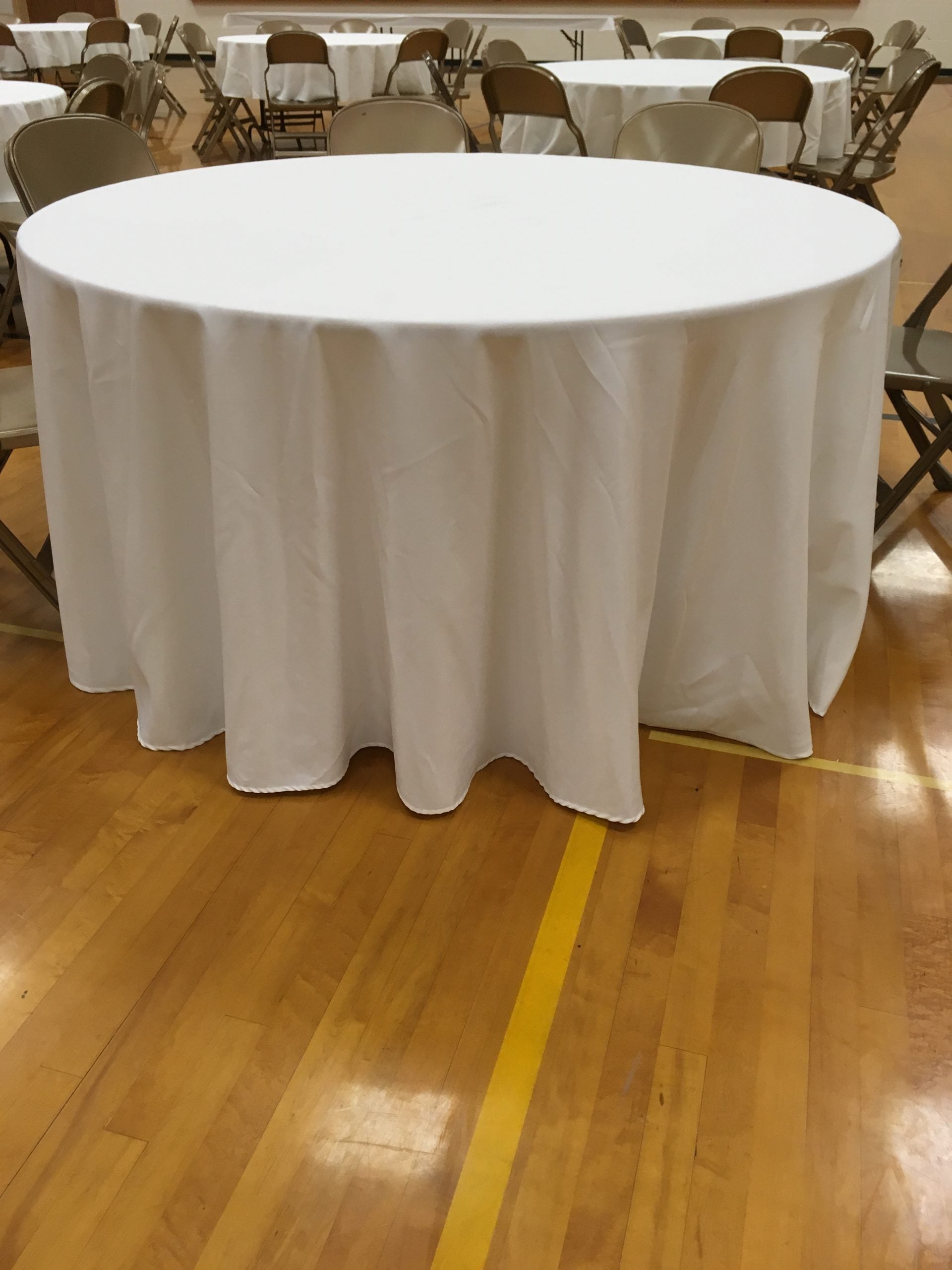 90" Round Linens, 108" Round Linens, 120" Floor Length Table Cloths fit beautifully on 60" round tables.