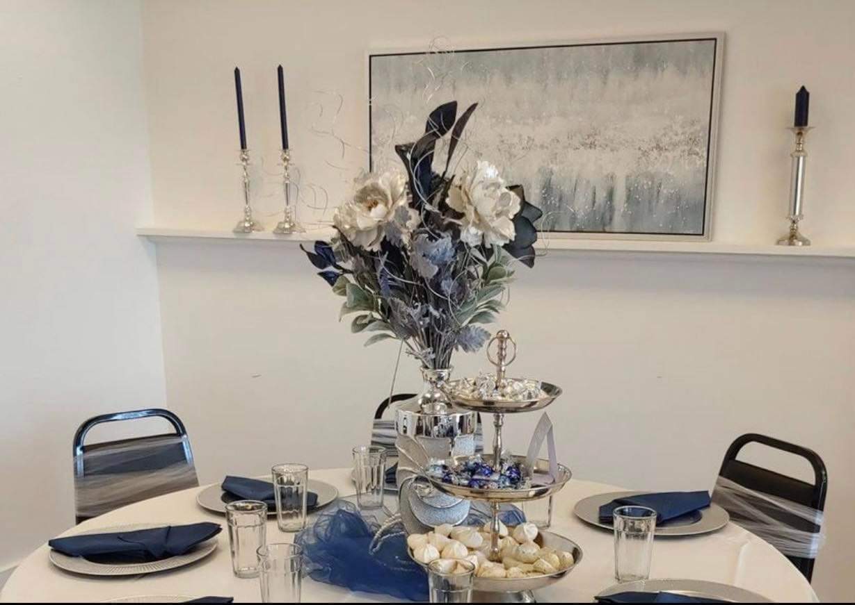 Silver 3-Tier Dessert Stand is 20" tall & tiers measure: 12", 10", 8" in diameter.