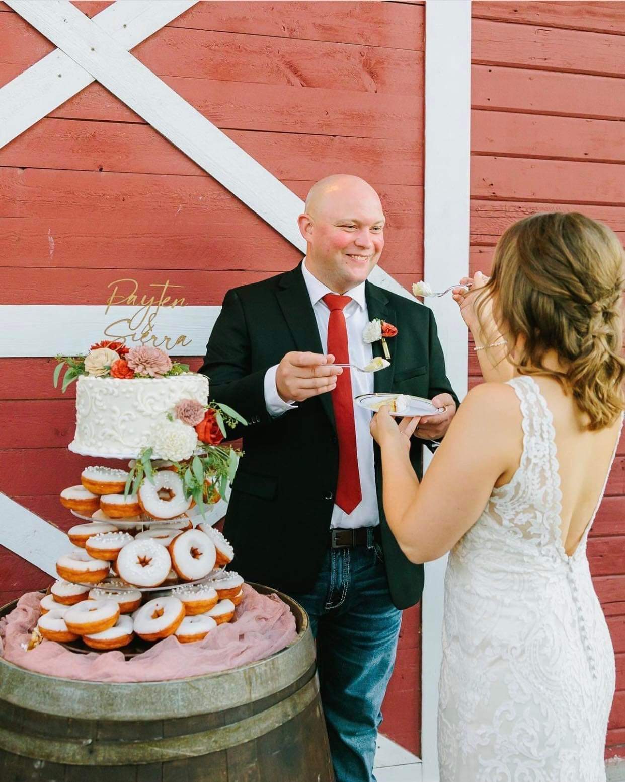 Oak Wine Barrels are perfect for any rustic touch, delectable dessert bars, delicious drink station, sign in spot, or display your cake. We have added two dark walnut stained wine barrels to pair with our darker backdrops. Then a pair of blonde oak barrels. The golden oak stain are wonderful accent to the Barn Door and have so many possibilities.